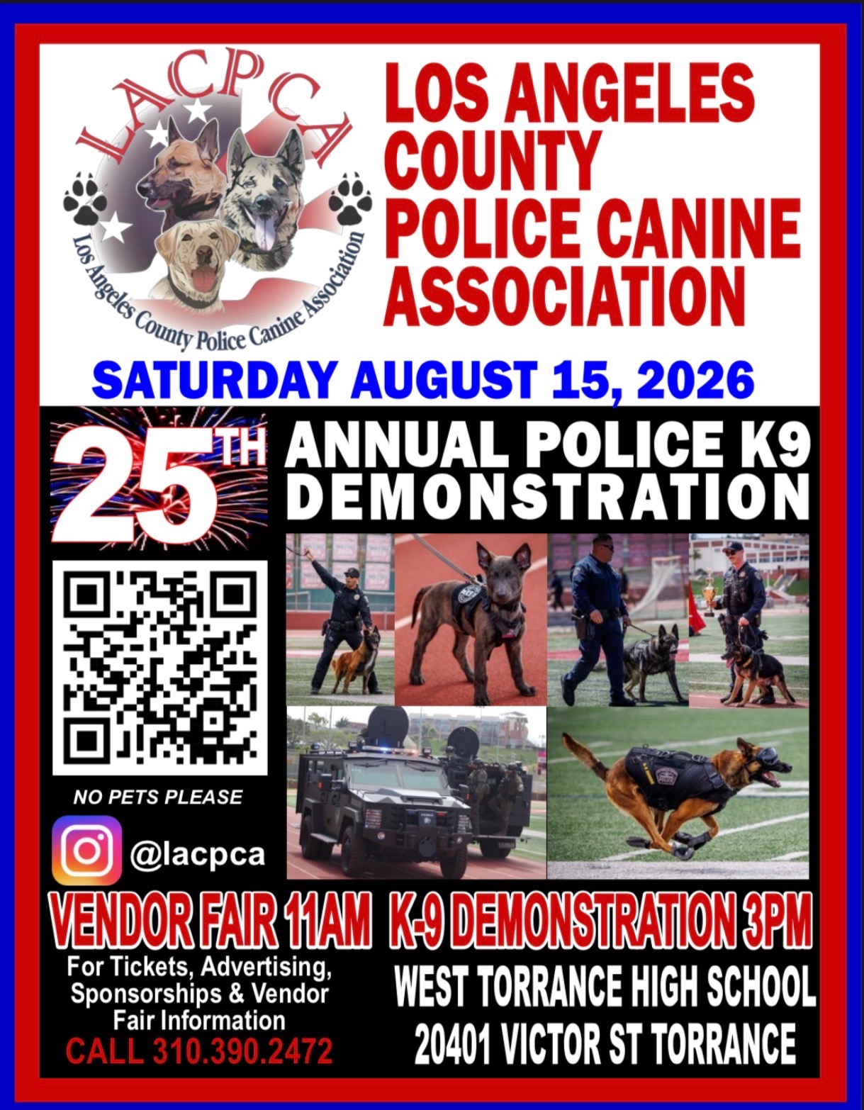 The K-9 Demonstration and Educational Public Safety Fair is a community event held at West Torrance High School. This exciting day features K-9 teams from various local departments showcasing their skills, discipline, and teamwork through live demonstrations. Guests can also enjoy educational exhibits, meet public safety professionals, and learn how K-9 units play a vital role in keeping our communities safe. It’s a fun, family-friendly event that celebrates teamwork, service, and community connection.